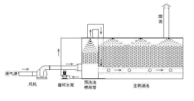惡臭氣體收集裝置→預(yù)處理裝置→生物過(guò)濾裝置→抽風(fēng)機(jī)→排放