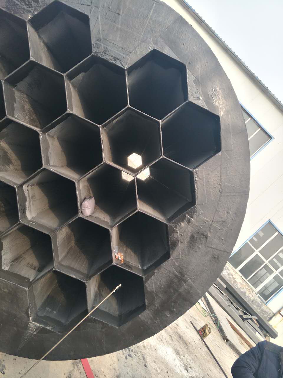 陽(yáng)極系統(tǒng)中的陽(yáng)極管采用正六方立式蜂窩狀結(jié)構(gòu),受力狀態(tài)好、結(jié)構(gòu)緊湊、六邊型結(jié)構(gòu)放電443297172491057593.jpg死區(qū)小。陽(yáng)集塵管內(nèi)切圓均為Ø360 mm長(zhǎng) 6 米。材質(zhì)導(dǎo)電玻璃鋼,由“拉劑工藝”加工而成,每組陽(yáng)集塵管束具有整體性,強(qiáng)度高、陽(yáng)集塵管的同心度、平行度高。陽(yáng)集塵管束由工廠制作并采用工裝組裝,管距誤差不得超過(guò)±1 mm,管束模塊尺寸誤差±2 mm,F(xiàn)場(chǎng)施工時(shí),將陽(yáng)集塵管若干組蜂窩狀的管束模塊組成一個(gè)整體,每組模塊安裝在支撐梁上。
