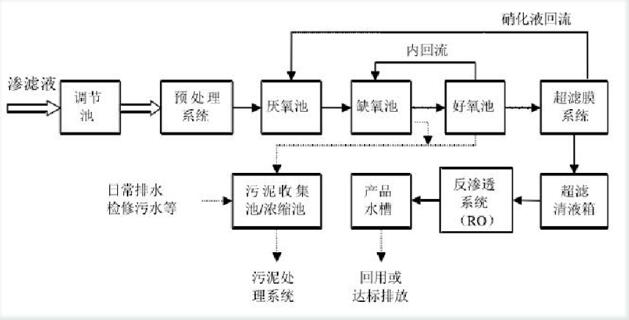 通過以上對垃圾滲濾液的各污染物分析及其水質(zhì)水量受當(dāng)?shù)貧夂蚝屠盥駡觥澳挲g”的影響,對處理方法一一進行說明和比較,結(jié)合生活垃圾滲濾液的具體情況以及污水處理的目的、建造、占地面積、能耗、運行費用、管理方面程度、運行可靠性及使用壽命等綜合因素的分析,以及我公司根據(jù)大量前期調(diào)研結(jié)果、滲濾液處理的經(jīng)驗并結(jié)合多年廢水治理的實踐經(jīng)驗,在進行充分、合理分析污水處理系統(tǒng)運行過程中將會出現(xiàn)的水質(zhì)沖擊負荷及當(dāng)?shù)氐木唧w氣候等情況后,特采用以下工藝: