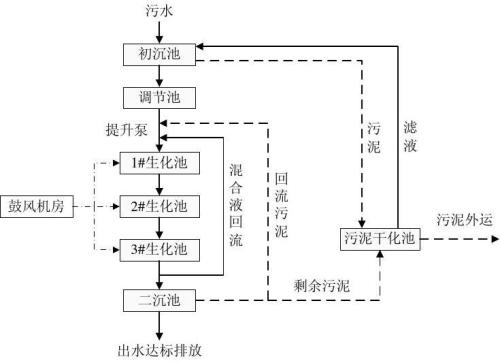 進水→沉淀池→厭氧消化池→厭氧生物濾池→拔風(fēng)管→氧化溝→進氣出水井→排水。