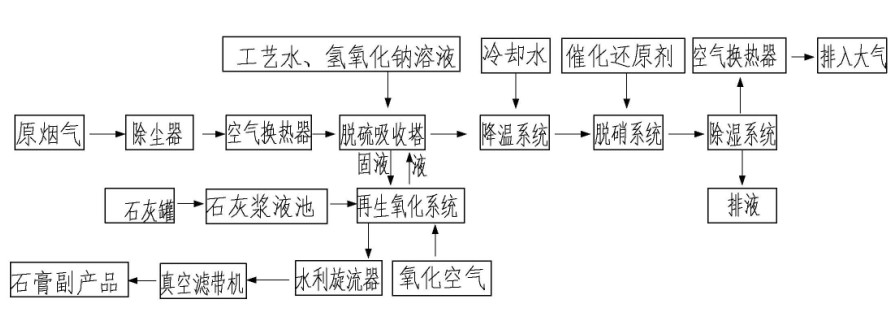 雙堿法脫硫+濕法催化脫硝工藝,整套系統(tǒng)由以下子系統(tǒng)組成:
